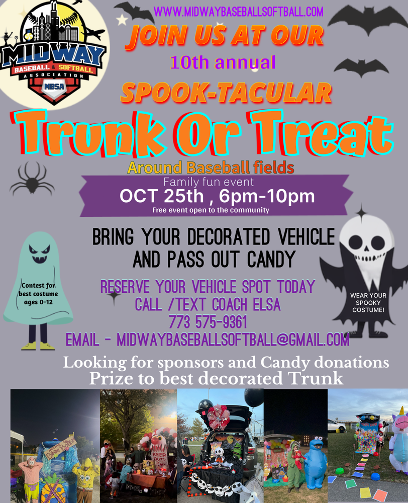 What is a Trunk or treat ? A event where Kids will be able to safely walk through our baseball park collecting candy from all the volunteers and local businesses that will have transformed their car trunks into spooky, creative, and fun trick-or-treat stations. Kids will collect a variety of candies and treats at each stop!